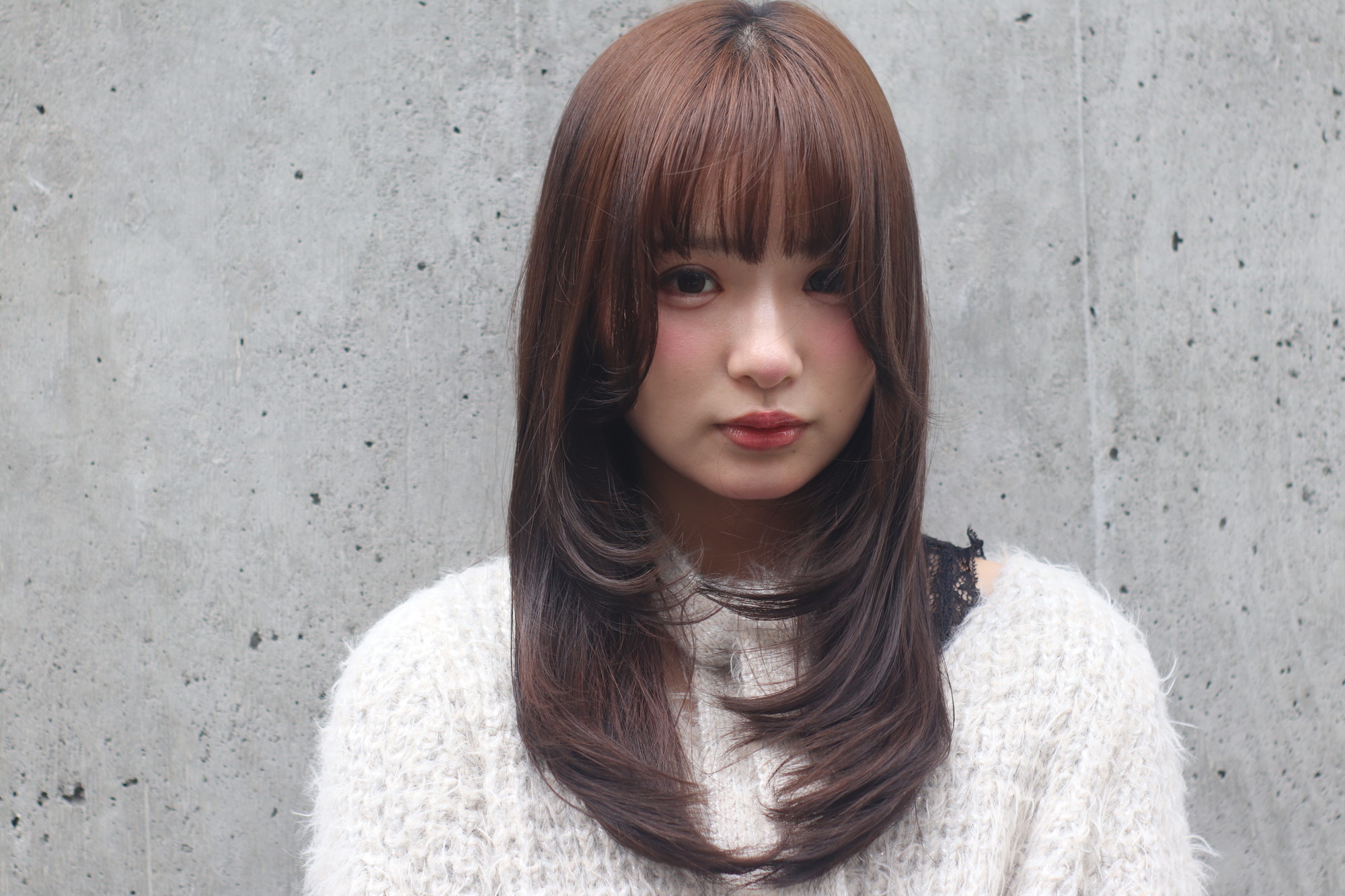 明るめカラーに似合うロングです。トップは、レイヤー入れていません。そのかわりに、サイドバングはしっかり切り込み、前上がりをかなり急斜面でカットしています。