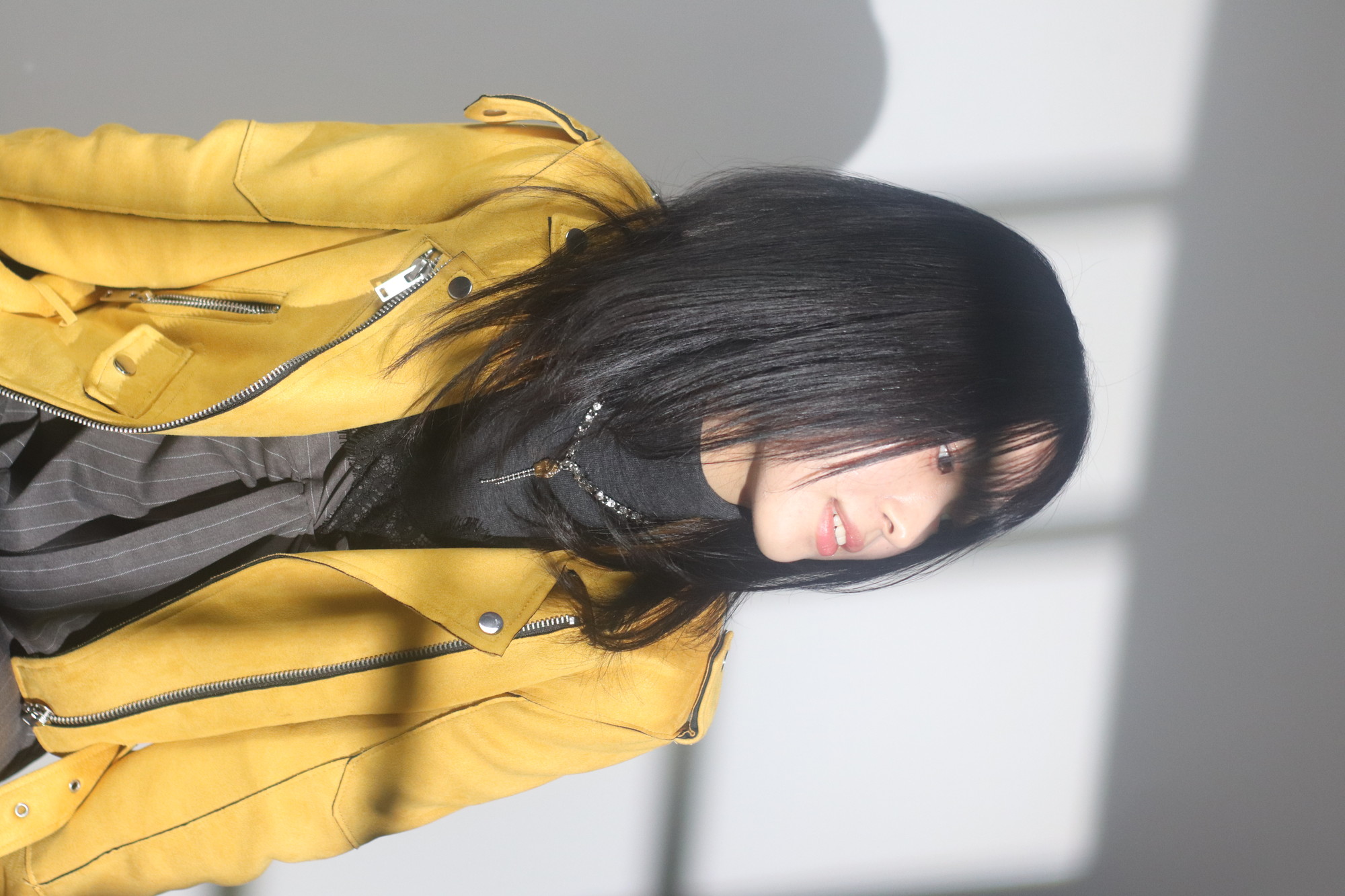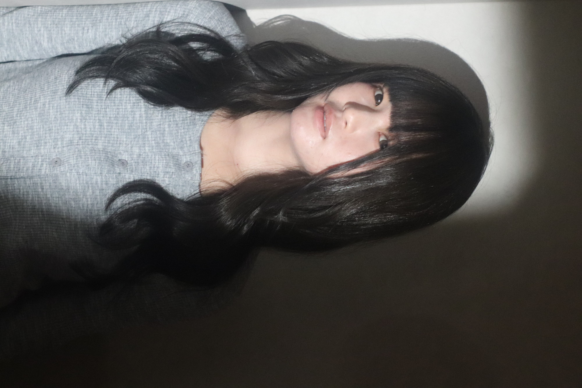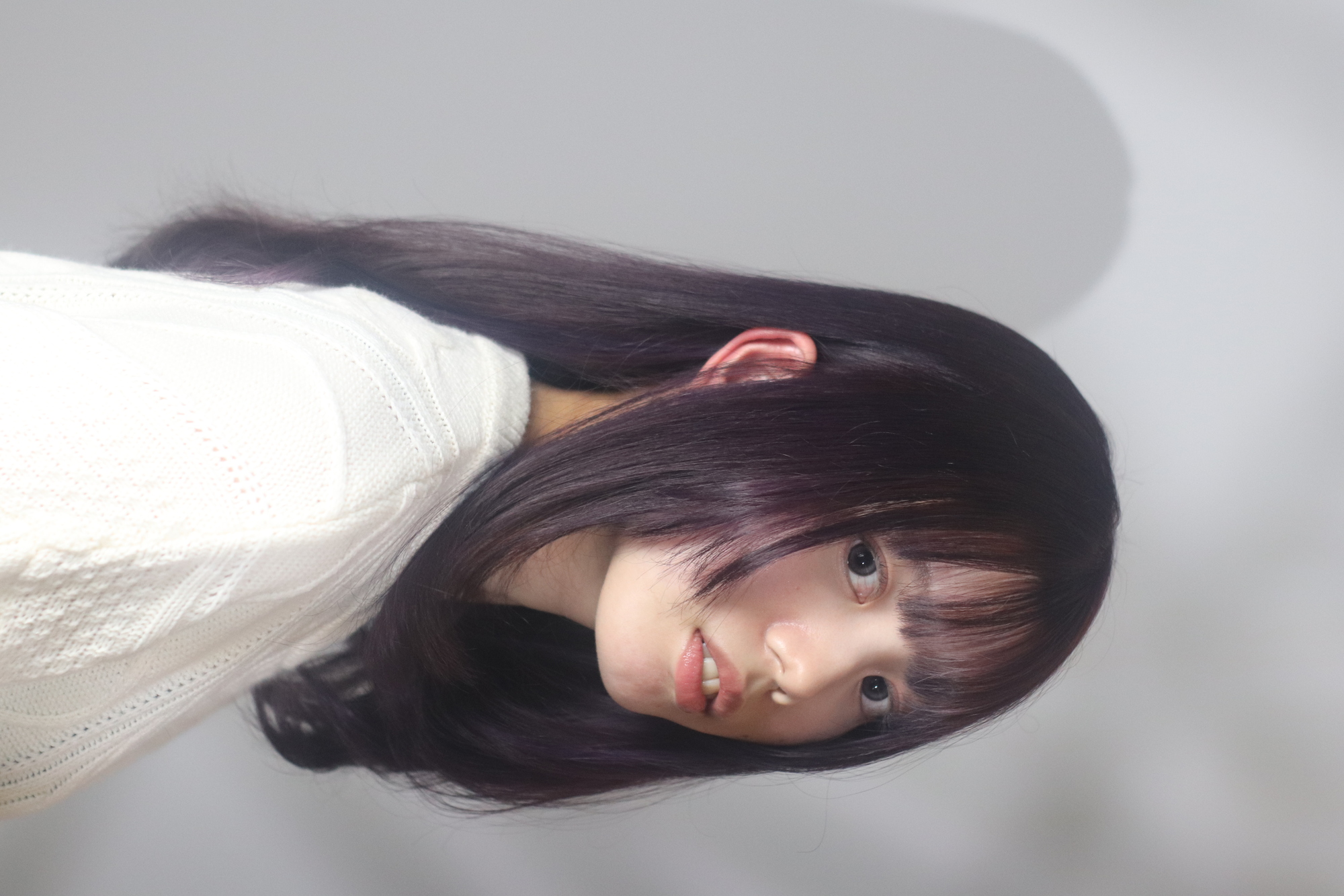 前髪ぱっつんです。ちょっと重めで。全体は緩めレイヤースタイル。カラーは、落ち着いたレッドブラウンです。