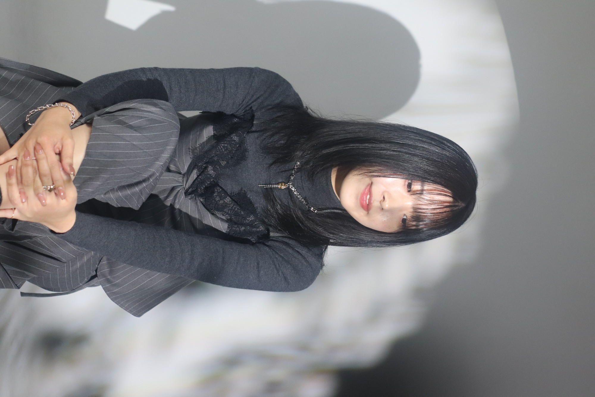 鎖骨ラインのミディアムボブ。毛量の多めの方は、中間〜毛先まで量を調整します。カラーはブルー系グレージュです。ブルーベースの方におすすめです。