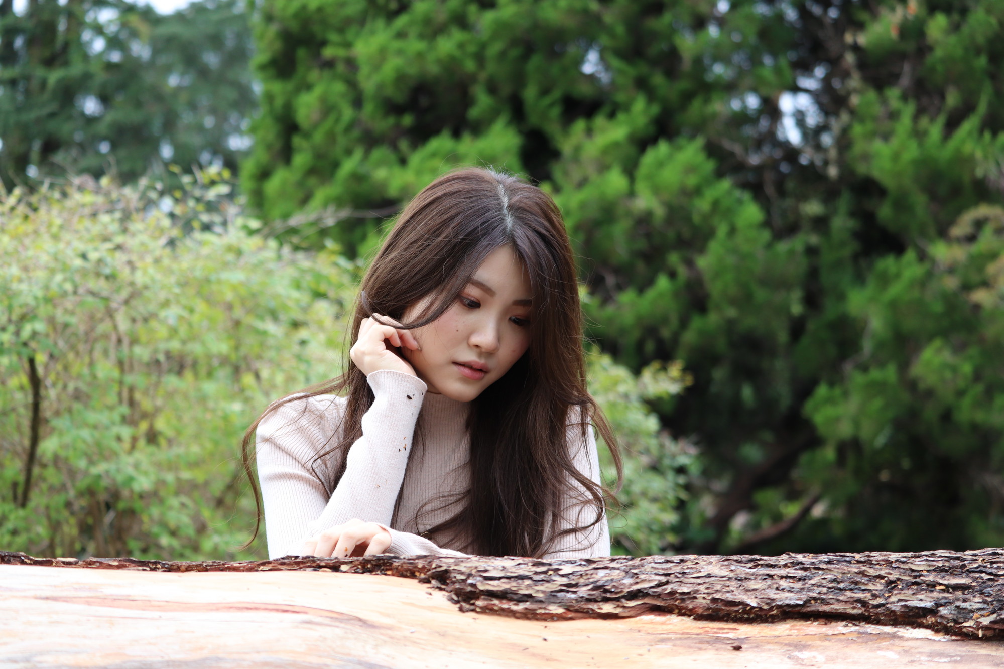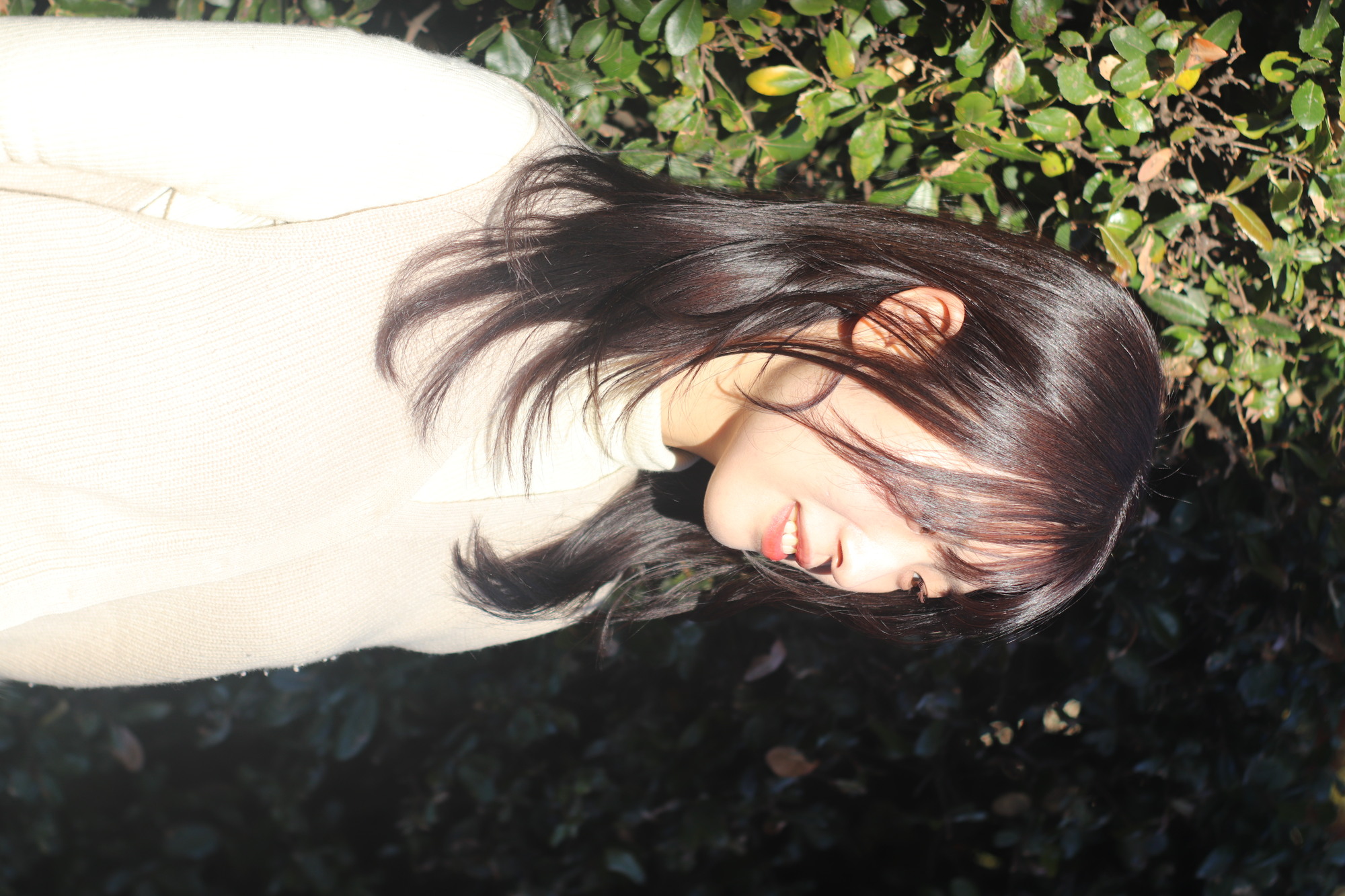 植物園で撮影しました。アッシュブラウンのカラーに、ロングレイヤースタイルです。前髪は無しで。大人っぽいイメージがお好きな方におすすめです。